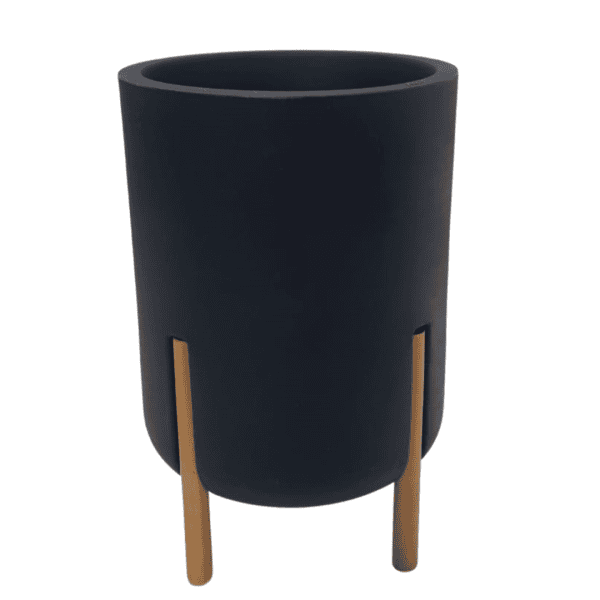 אדנית בגימור שחור חלק בעיצוב גלילי מינימליסטי, המשלבת רגלי עץ אלגנטיות – יוצרת מראה נקי, חכם ויוקרתי שמתאים כמעט לכל סגנון עיצוב.