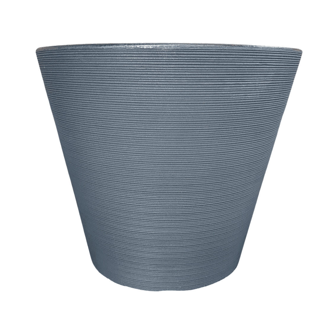 אדנית עגולה מרשימה עם טקסטורת פסים אופקיים עדינים לאורך כל הגוף – מראה קלאסי בגימור מודרני, בגוון אפור כהה עשיר.