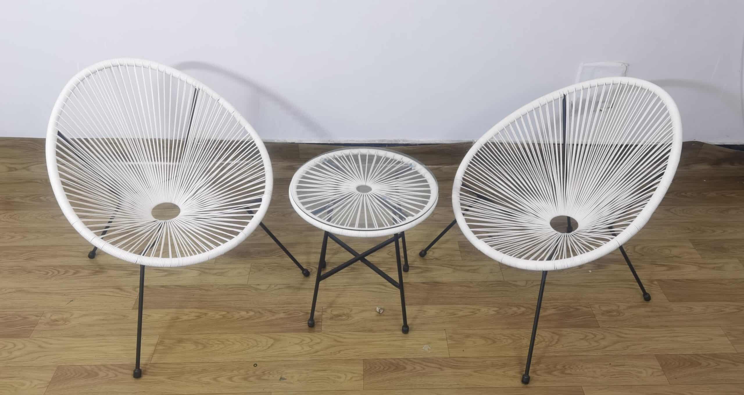 סט זוגי לפינת קפה בגינה, במרפסת או בתוך הבית – כולל שני כיסאות יחיד בעיצוב דמוי ביצה ושולחן קפה עגול עם זכוכית מחוסמת שקופה. עשוי מתכת בצביעה מגולוונת ורצועות PVC עגולות בצבע לבן. מתאים גם למשרדים ופינות המתנה.