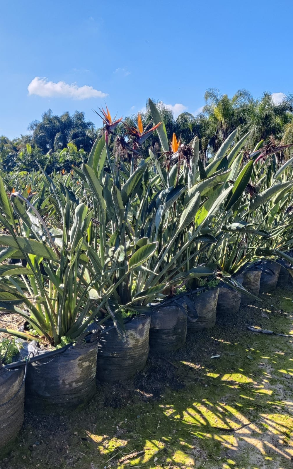 ציפור גן עדן רגינה במיכל 50 ליטר, צמח טרופי מרשים בעל עלים ירוקים זקופים ופריחה אקזוטית ייחודית. מתאים לגינות, חצרות וכניסות מעוצבות. עמיד לאקלים הישראלי ובעל נוכחות דקורטיבית חזקה.